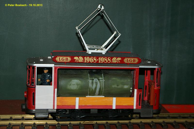 ![]() Man nehme einen Tankkessel und ein LGB Straßenbahnmodell und vereinige beide Teile. Der Tank ist ein Spur 1 Tankkessel. Er musste für den LGB Straßenbahnwagen gekürzt werden. |