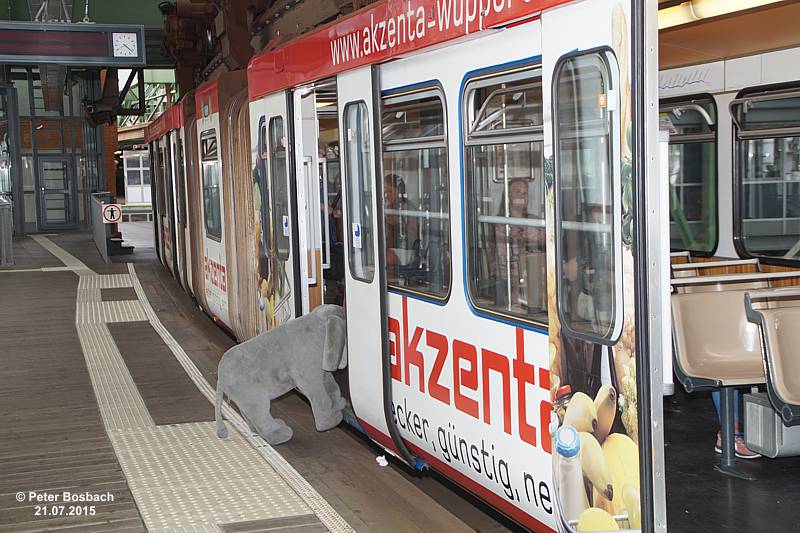 ![]() Was macht der denn auf em Bahnsteig? Ach, ja, da war doch was! Genau vor 65 Jahren, am 21.07.1950 war der Crikus Althof in Wuppertal. Als Werbegag kam man auf die Idee mit einem Elefanten Schwebebahn zu fahren. Zuvor war der Elefant Tuffi, so wurde die kleine Dame geannant in anderen Städten bereits mit der Straßenbahn gefafren. Man stieg am Alten Markt, Richtun gvohwinkel ein. Entweder durch das Blitzlichtgewitter der Fotografen, oder durch das Quietschen und Wanken der Bahn, bekam Tuffi wohl Angst und dann geshah es. Er zerstörte einen Teil der Seitenwand und fiel dann in die Wupper. Er hatte Glück und zog sich nur eine kleine Schramme am Po zu. Mit Hilfe eines Feuerwehrkrans wurde er zurück auf die Straße gehievt und dann ging es zurück zum Carnaper Platz. Später wurde Tuffi in den Vorstellungen gefragt, ob er noch einma mit der Schwebebahn fahren würde. Mit einem hefitg, verneinenden Kopfschütteln beantwortete er diese Frage. Gerichtliich hatte diese Geschichte auch noch Folgen. Der Circusdirektior und ein Stadtwerke Mitarbeiter wurden zu Geldstrafen verurteilt. Seit dem darf kein Elefant mehr in der Schwebebahn fahren. |