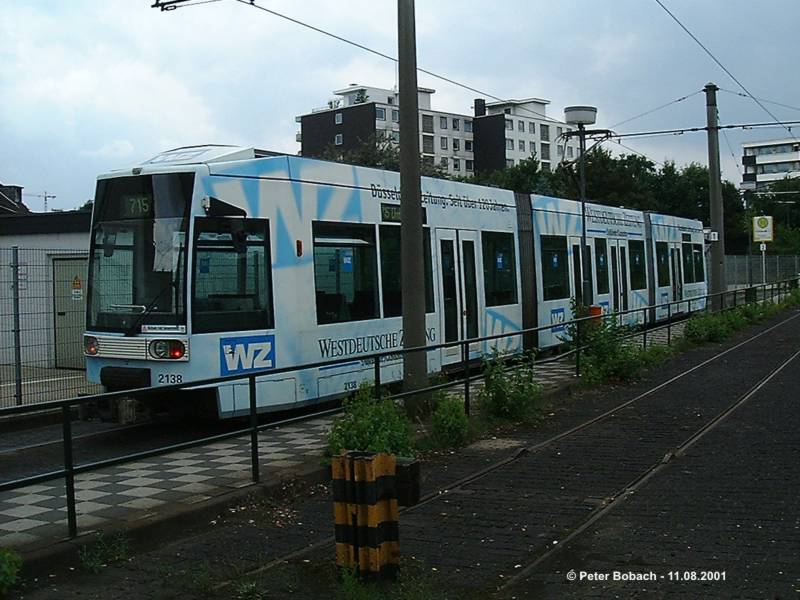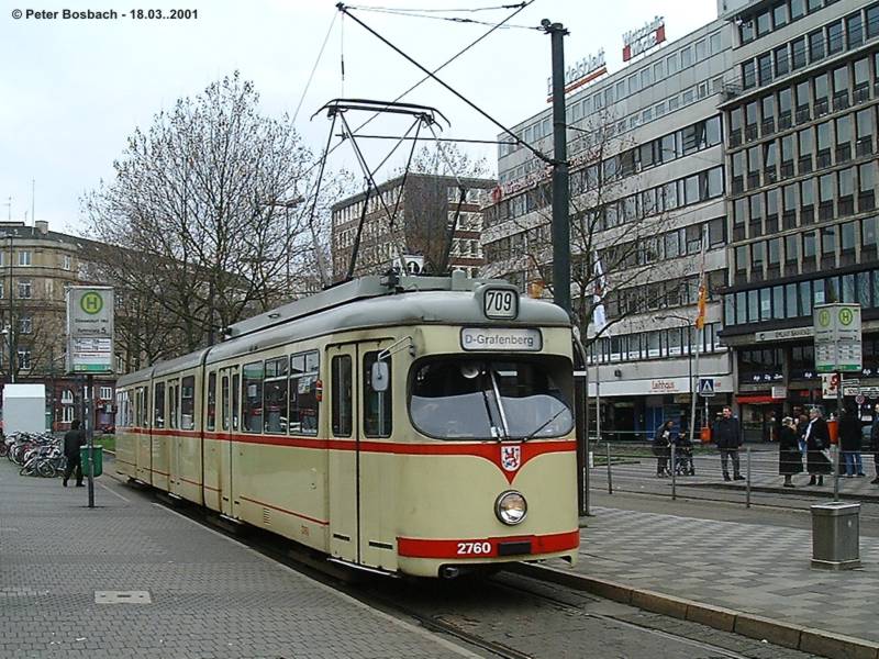 ![]() Im Jahre 2001 die neueste Generation. 7 von 8 Fahrzeugen waren an diesem Tag im Einsatz. Hier Tw 2004 auf Linie 707 an der Haltestelle Universität Ost. Newest Generation on Service. 8 Trams are in Düsseldorf. 7 are on duty. Here Tram 2004 on Route 707 at stop Universität Ost. |