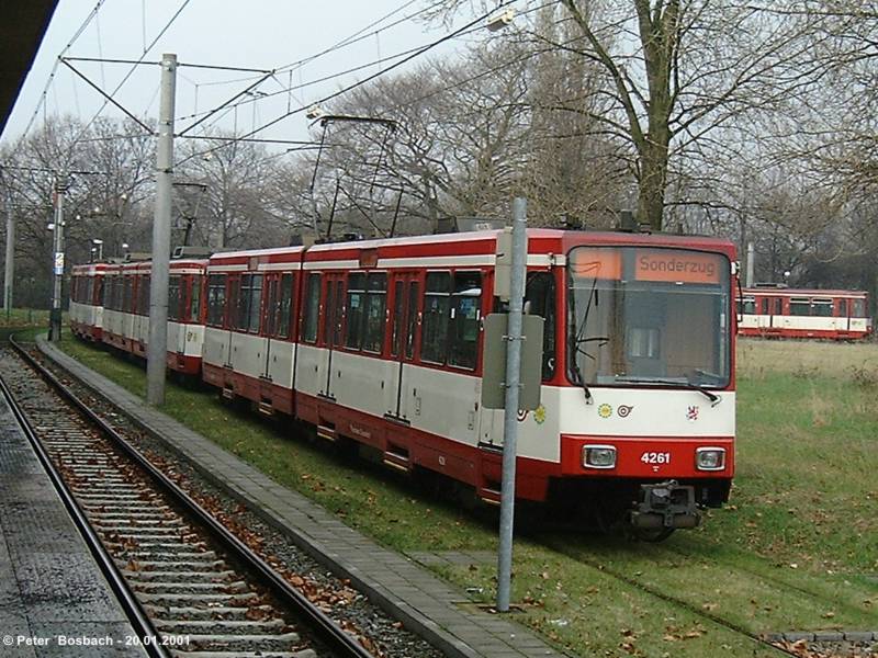 ![]() 4261 + 4003 + 4284 bilden hier den Dreiwagenzug. Er steht als Reserve am Düsseldorfer Messegelände. (Boot) Foto: 20.01.2001 A three wagon tram train build with tram 4261 + 4003 + 4284 is here seen at the Exhibition Center Düsseldorf. (During the Boat exhibition) - Photo: 20.01.2001 |